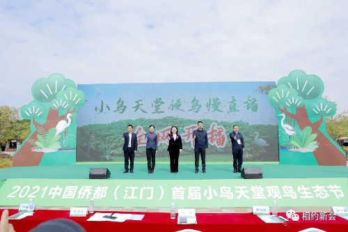 现场还进行了小鸟天堂生态展示慢直播启动仪式,并为“爱鸟·爱家·爱自然”2021 中国侨都(江门)鸟类生态摄影大赛暨侨乡观鸟胜地推选行动授旗。