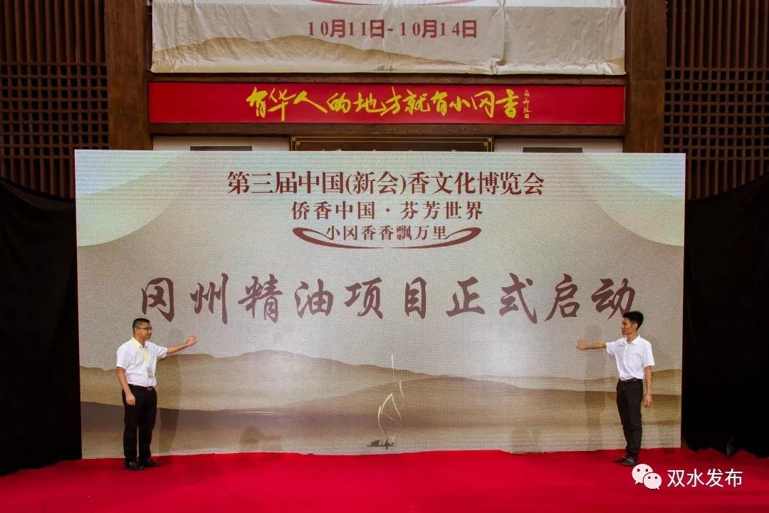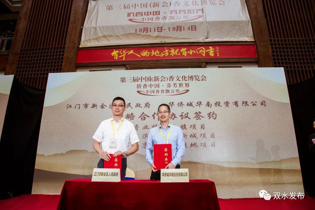 开幕式上,新会区人民政府与华侨城华南投资有限公司签订了战略合作协议,围绕“香业+文化+旅游+养生+互联网”的发展目标,共同打造中国香业特色小镇、基背岛滨江生态新城等项目。由新会区冈州香业有限公司投资3亿元的年产50吨高纯度天然檀香精油项目在博览会上正式启动。