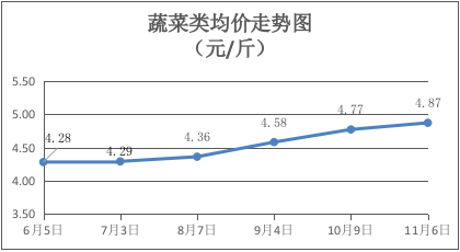 蔬菜类商品价格微幅上涨。本期31种蔬菜价格波动情况为13涨13平5跌,综合零售均价为4.87元/斤,环比上涨2.10%。13个品种零售均价环比上涨,其中:青瓜、菠菜、上海青零售均价为每斤4.75元、8.25元、4.50元,环比上涨21.79%、13.79%、12.50%;5个品种零售均价环比下降,其中苦瓜、丝瓜、大白菜零售均价分别为每斤4.75元、5.00元、3.25元,环比分别下降9.52%、9.09%、7.14%。