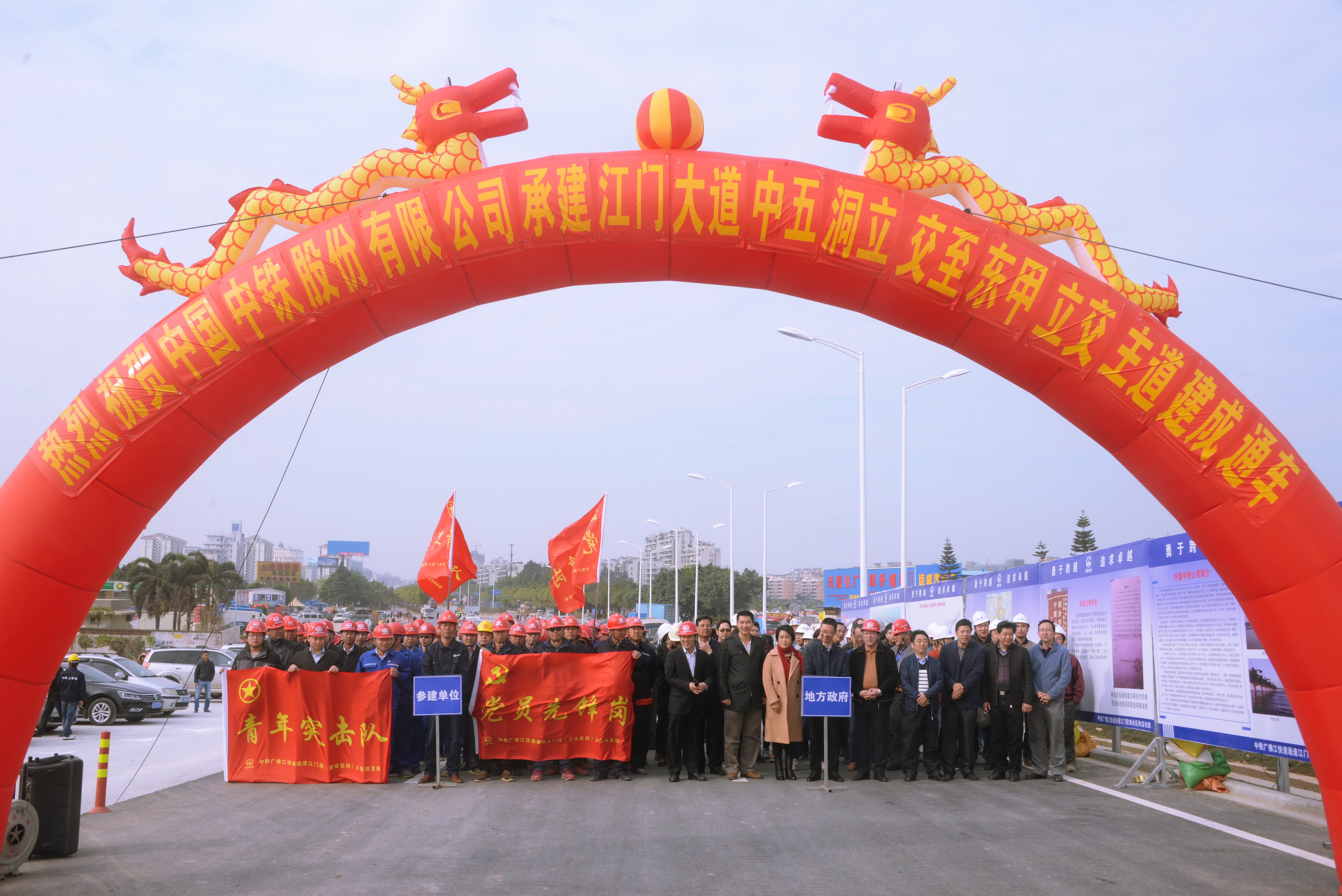 五邑路至三江段主辅道工程:路线起点五邑路立交隧道,经会城大道、新峰路、跨冈州大道东,沿新会大道到东甲,经江门站至茶坑并入金门公路,终点接中开高速三江互通。工程节点包括:会城大道跨线桥、新会大道高架桥、东甲立交、站前隧道、银鹭立交、茶坑隧道、大洞大桥扩建等。路线全长15.6公里,按双向8车道主道+双向4车道辅道标准建设,采用一级公路兼具城市道路功能的标准,设计速度为80公里/小时,沥青混凝土路面。全线总投资估算52.6亿元。主道工程分为六个标段实施,已全面铺开施工。12月28日通车的五邑路至东甲立交主道就是其中的一、二标段。