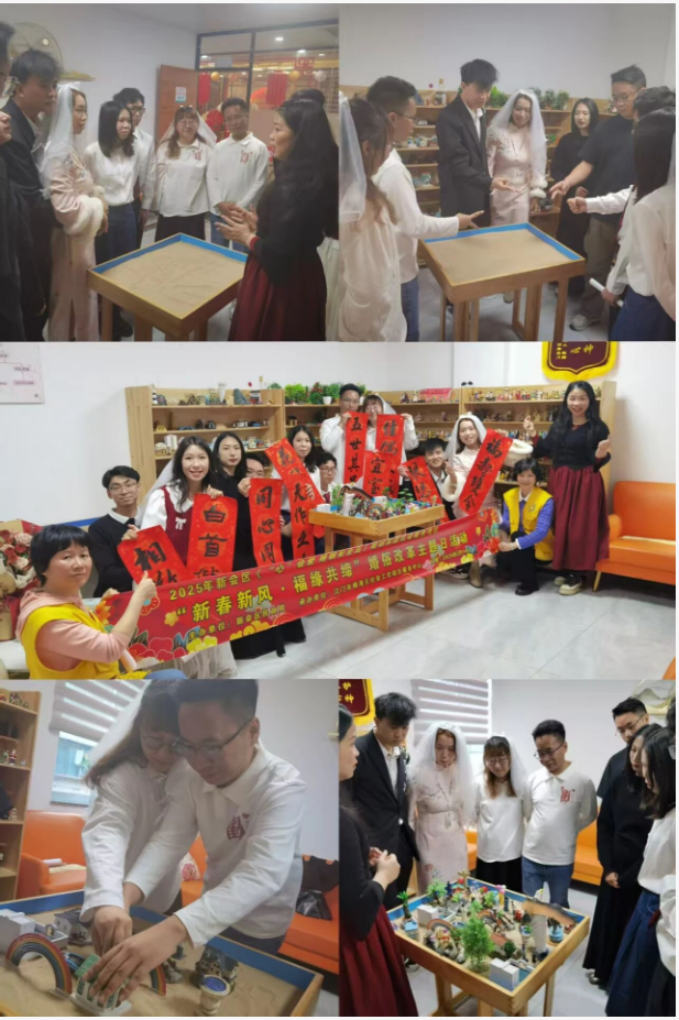 在“同心共建·爱暖家园”环节,新人们在专业社工的引导下,共同参与“未来家园”主题沙盘游戏。通过摆放融入“家”“福”“和”等沙具,在沙箱中共同构建他们对未来生活的想象。这个非语言的过程,是一次心灵的深度对话,让新人们在协作中更深刻地理解彼此的思维模式、性格差异和内心期望,在互动中增进理解,学习沟通与共建家庭的技巧,为婚姻生活打下良好基础。该活动也是婚姻辅导项目中“新婚沙盘游戏”服务模块的生动实践,旨在预防未来婚姻危机,提升夫妻情感质量。