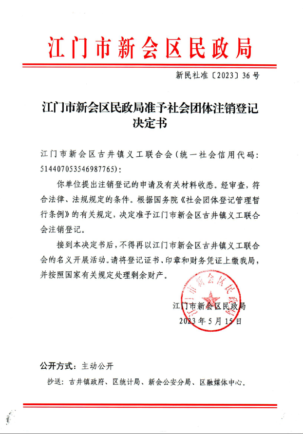 (江门市新会区古井镇义工联合会)社会团体注销登记决定书