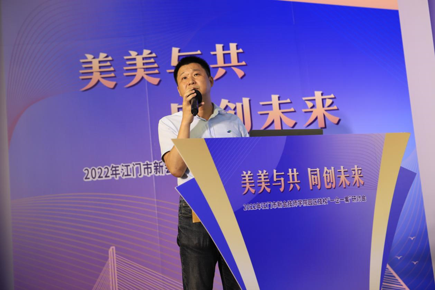 叶长新同志在致辞中指出,园区技校建设是2022年江门市政府的重点工作,新会将以此为契机,进一步建强“园区技校”工作体系,高水平打造“广东技工”平台载体,加快新会技师学院新校区的建设;高标准推进校企合作,聚焦市八大战略产业和我区三大主导产业,主动对接大中型企业,加快产教融合发展,深化校企合作办学,持续开展企业新型学徒制、现代学徒制、订单式人才培养;高要求深化产教融合,聚焦重点产业领域企业需求,用好人才政策,全力打造我区技能人才“储水池”。