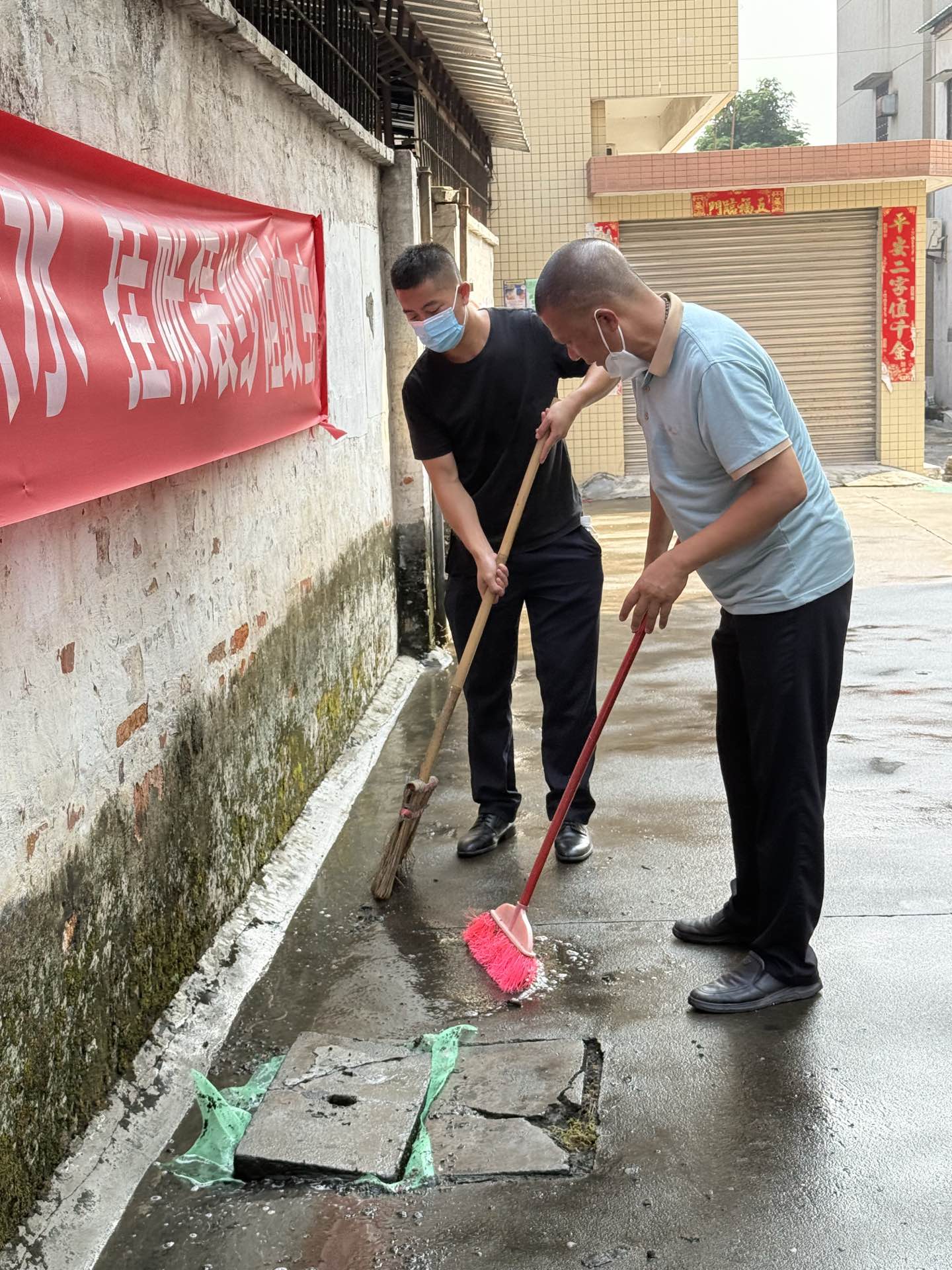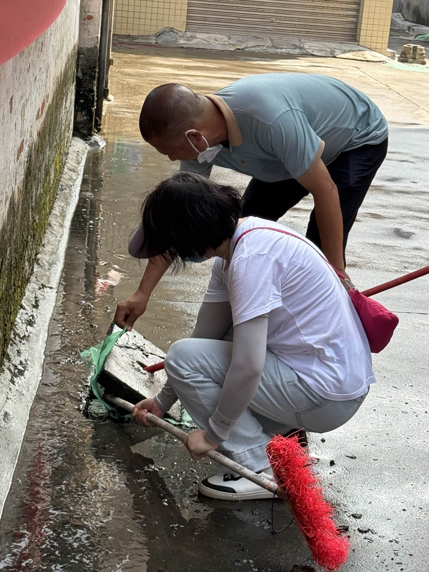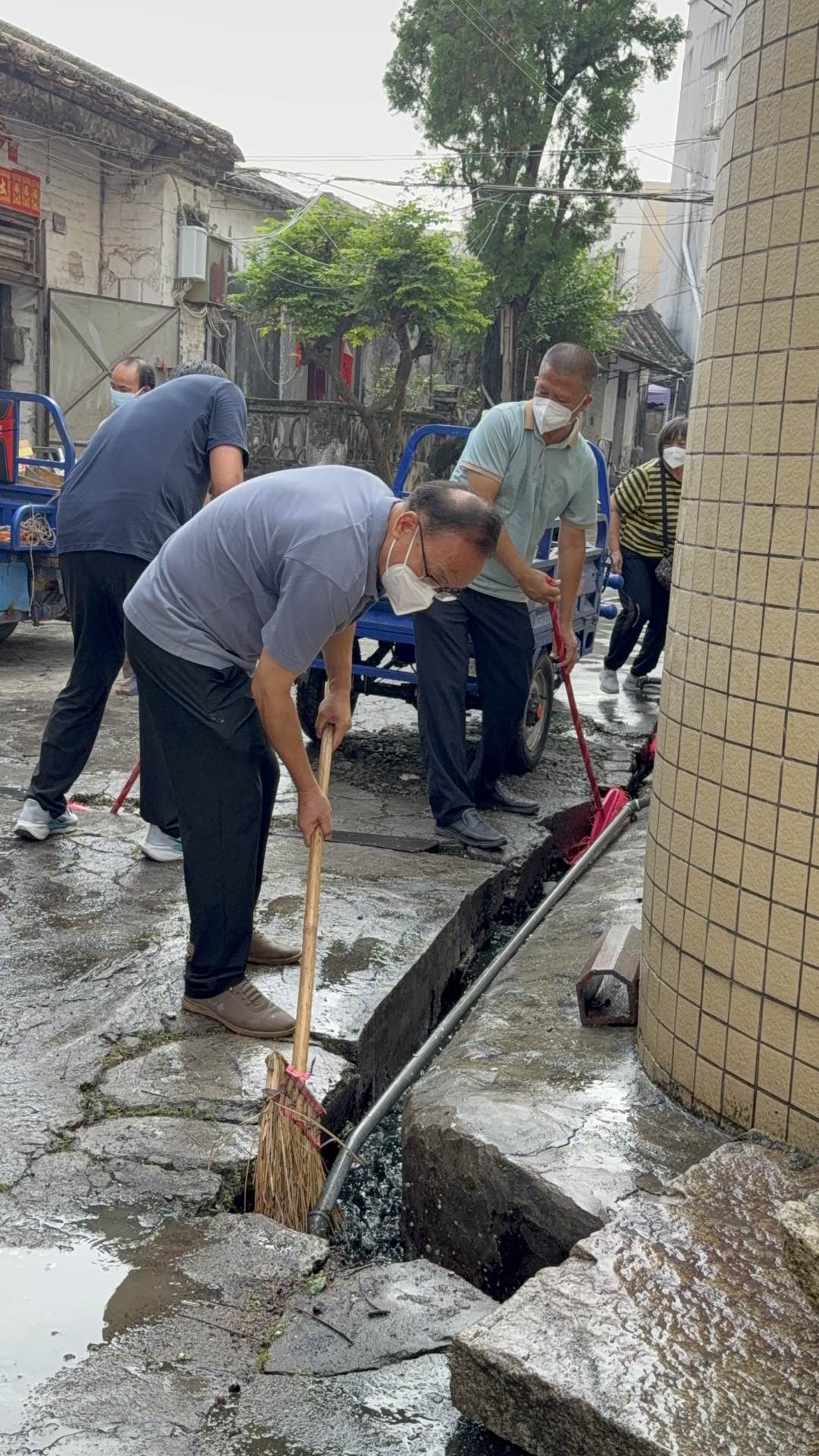 行动现场,党员干部们迅速形成合力,以“源头防蚊、全域清洁”为目标高效推进工作。大家分工明确、配合默契、干劲十足,“地毯式”推进清洁、清积、消杀全流程工作,重点对村民房前屋后、公共活动区域的垃圾杂物进行全面清运,逐一排查并清除各类坛罐、容器内的积水。针对卫生死角、沟渠两侧、墙角缝隙等蚊虫易栖息处,用扫把细致清理杂草、落叶与堆积杂物,所有垃圾及时装入垃圾袋清运,从环境层面切断蚊虫停留孳生的“温床”,同时逐一排查下水道口、废旧盆罐、空调外机接水盘等易积水点位,对积水当场倒除,对下水道及时疏通,还针对绿化带低洼处等无法彻底清除积水的区域精准投放灭蚊幼药剂,从根源上阻断蚊虫繁殖链条,消杀组对冷巷、墙角、绿化带边缘等蚊虫高频出没区域进行全方位消杀,有效降低成蚊密度,进一步巩固防蚊灭蚊效果。经过整治后,结对村整体环境整洁度与卫生安全系数显著提升。