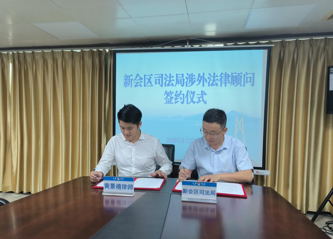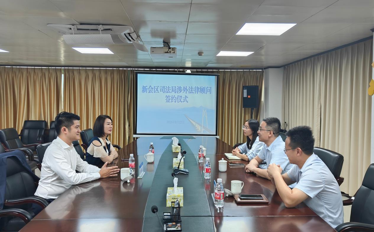 为进一步深化我区涉外法治人才交流合作,加强涉外公共法律服务供给,更好地满足辖区群众、企业日益增长的涉外法律服务需求,近日,新会区司法局举行涉外法律顾问签约仪式,正式聘请粤港澳大湾区执业律师、澳门执业律师黄景禧担任涉外法律顾问。区司法局党组书记、局长童铁东,党组成员、副局长李健强及相关业务股室人员出席了活动。