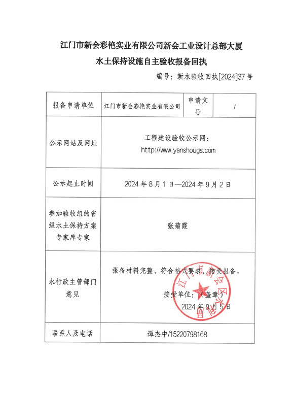 江门市新会彩艳实业有限公司新会工业设计总部大厦水土保持设施自主验收报备回执