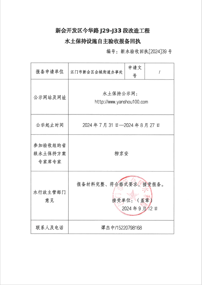 新会开发区今华路J29-J33段改造工程水土保持设施自主验收报备回执