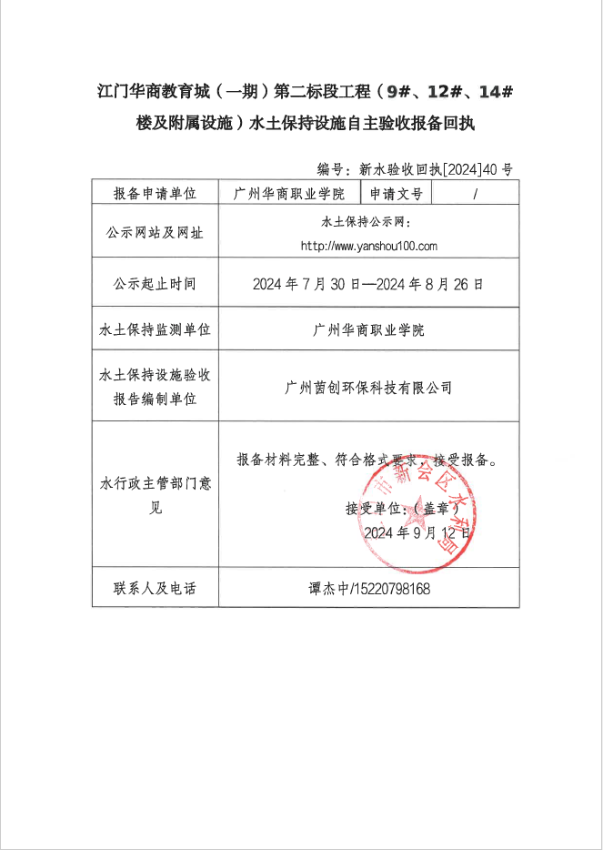 江门华商教育城(一期)第二标段工程(9#、12#、14#楼及附属设施)水土保持设施自主验收报备回执