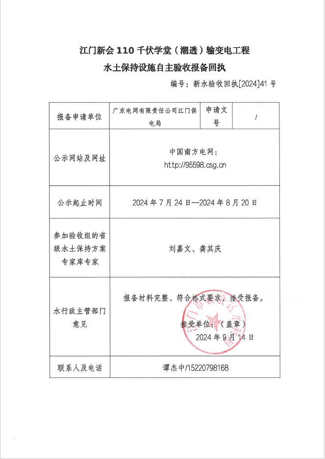 江门新会110千伏学堂(潮透)输变电工程水土保持设施自主验收报备回执
