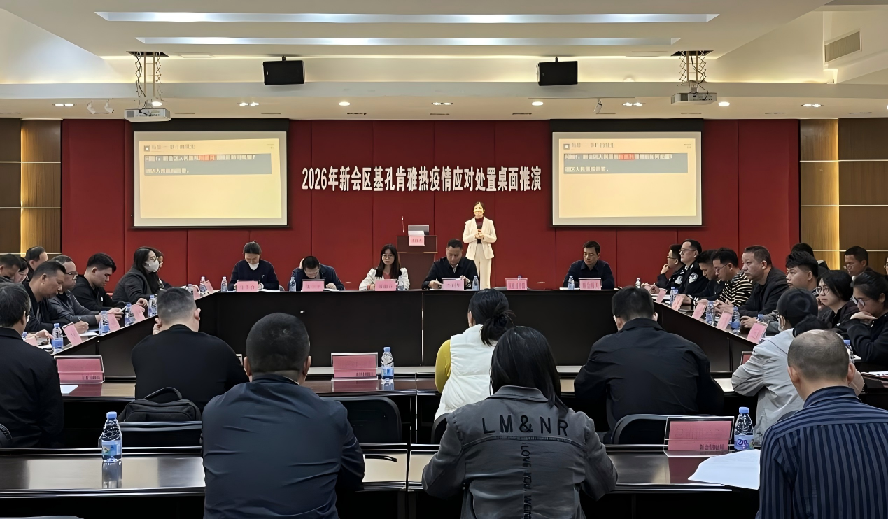 为切实提高我区基孔肯雅热疫情应急处置能力,由新会区虫媒传染病疫情防控指挥部办公室主办、新会区卫生健康局承办的2026年新会区基孔肯雅热疫情应对处置桌面演练于2月11日下午在区人民医院综合供应楼5楼多功能厅举办。市疾控中心、区卫生健康局、区疾控中心、新会公安分局、圭峰会城、同德社区、区人民医院等单位参加了演练。各镇街及区虫媒传染病疫情防控指挥部办公室各成员单位近60人观摩了演练。