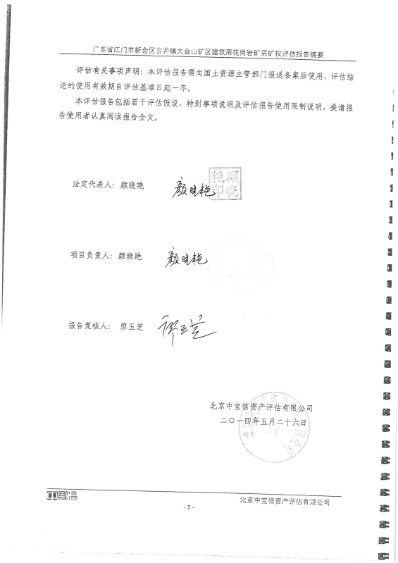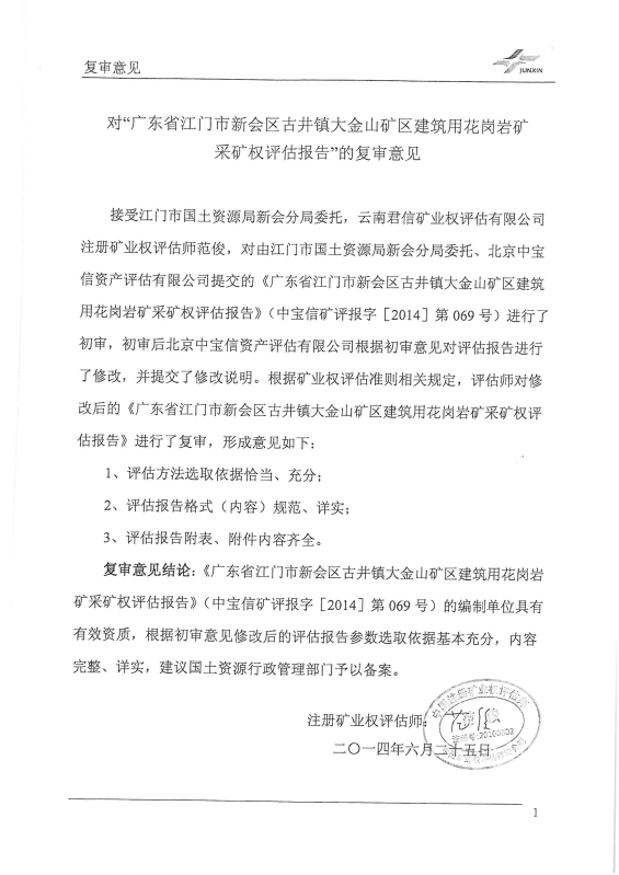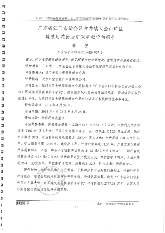 关于《广东省江门市新会区古井镇大金山矿区建筑用花岗岩采矿权评估报告》的公示