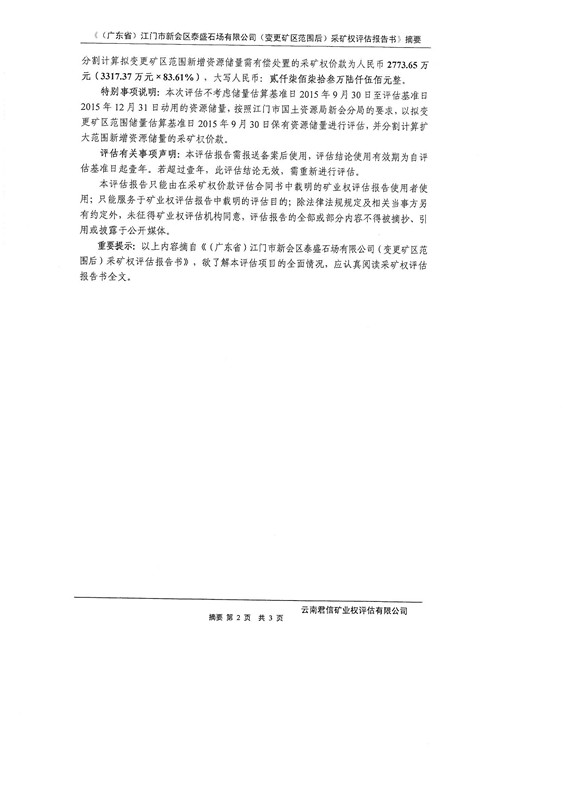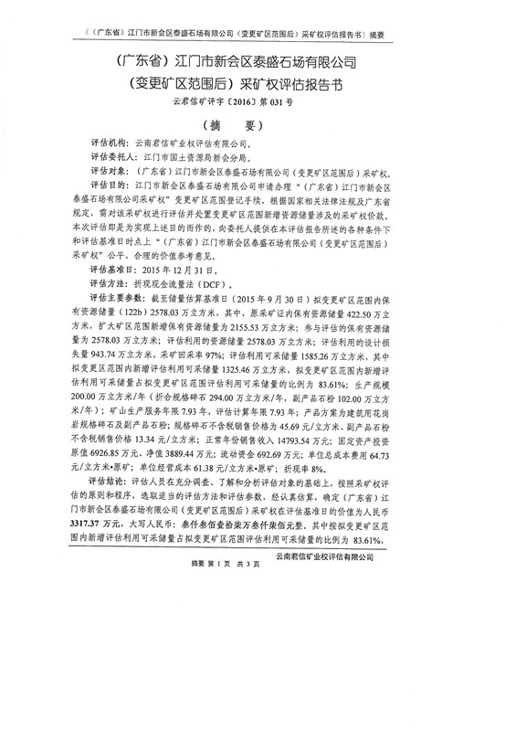关于《(广东省)江门市新会区泰盛石场有限公司(变更矿区范围后)采矿权评估报告书》的公示