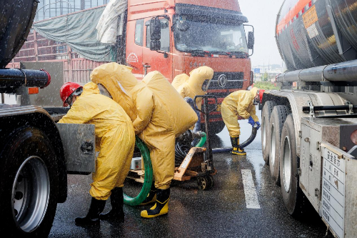 本次演练按照“着眼实战、讲求实效”的原则,模拟一辆载有20吨二甲苯的槽罐车行驶在珠西新材料集聚区内部道路与一辆货车发生追尾,事故导致货车司机受伤昏迷,槽罐车罐体尾部破损,二甲苯泄漏至园区雨水管网,情况十分危急。