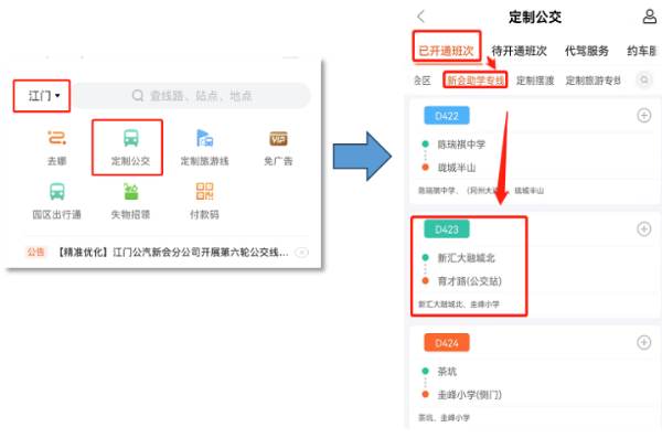 4.登录后,点击“定制公交”进入“已开通班次”进入新会助学专线,选择适合您的线路。