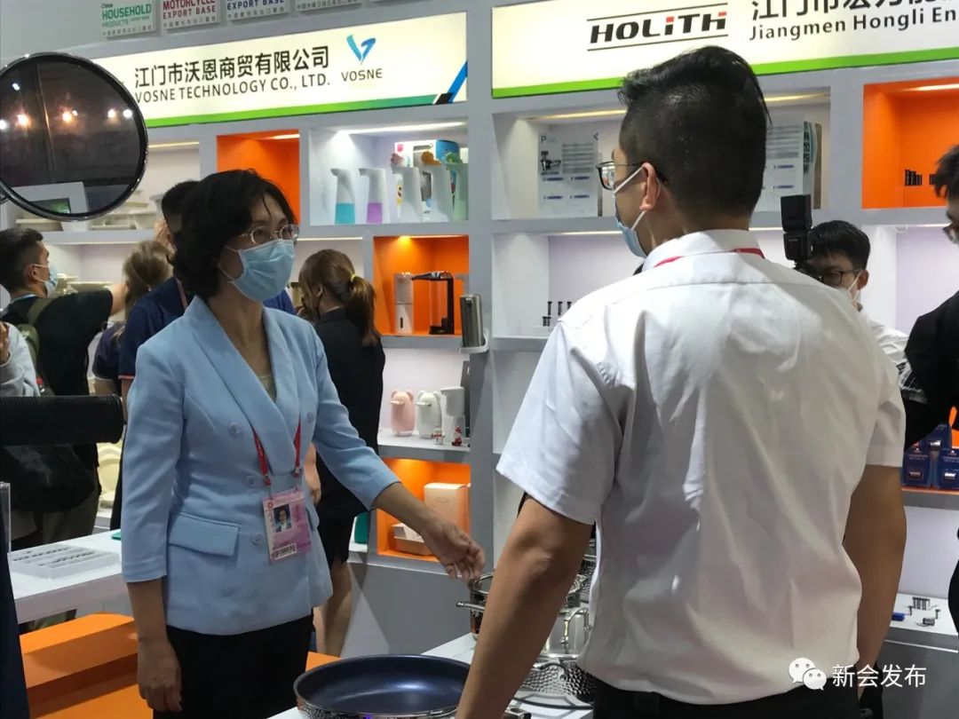 为大力宣传江门的国家及省级外贸转型升级基地产业及产品,江门市首次在广交会上打造约250平方米的“江门制造”推广专区,重点展示摩托车、水暖卫浴、五金不锈钢、家用电器等江门制造的产品。其中,我区有4家五金不锈钢企业在“江门制造”专区设展。吴晓晖等市、区领导参观了我区参展企业的产品,在新会区钰泽金属有限公司展位,一款由特殊材料制成的锤纹锅引起了吴晓晖的注意,她一边拿起锤纹锅,一边向企业工作人员询问它的功能和展销情况等,吴晓晖充分认可这款本土创新制造的锤纹锅,并表示很有市场潜力。