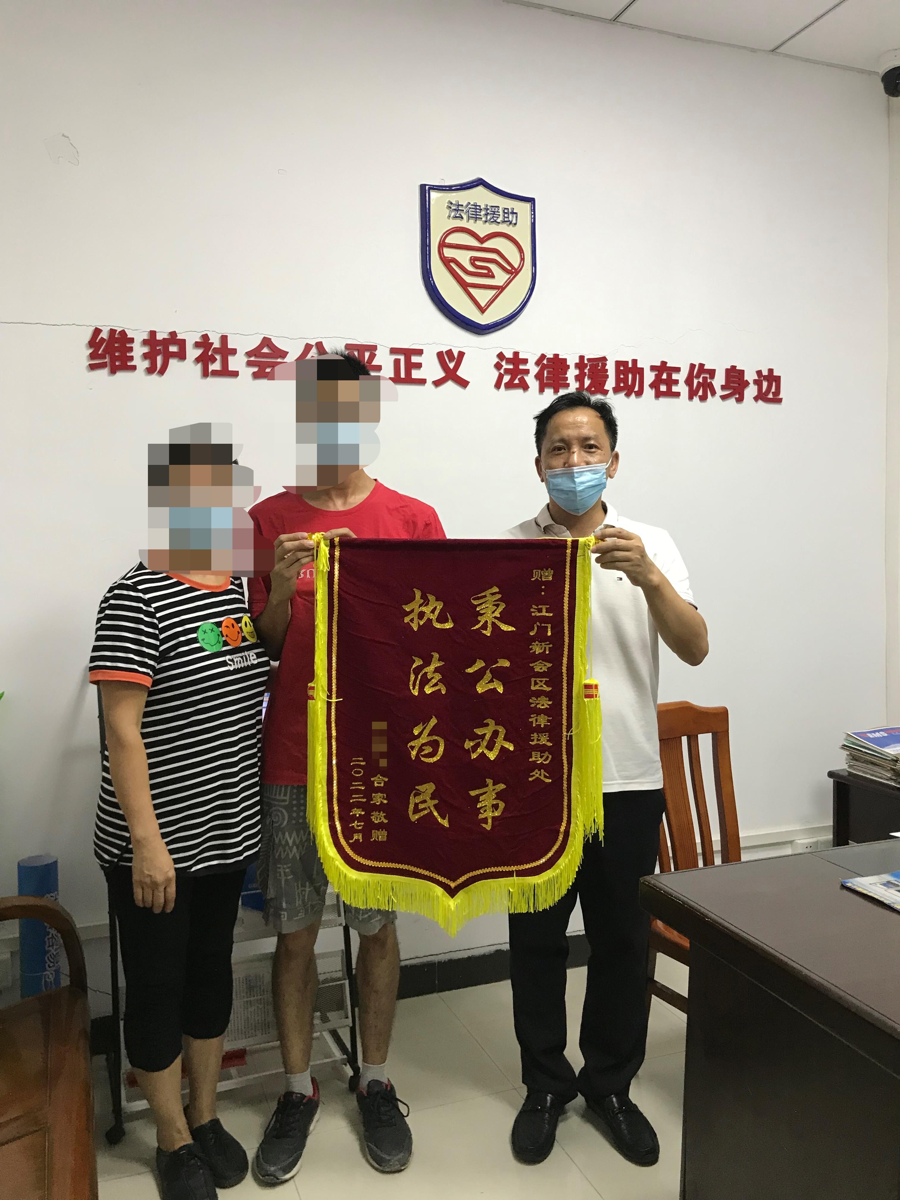 近日,受援人张某来到新会区法律援助处,将一面印有 “秉公办事,执法为民”的锦旗送到工作人员手中,借此表达对区法律援助处和法援律师的感激之情,使其历时近三年的案件得以圆满解决。