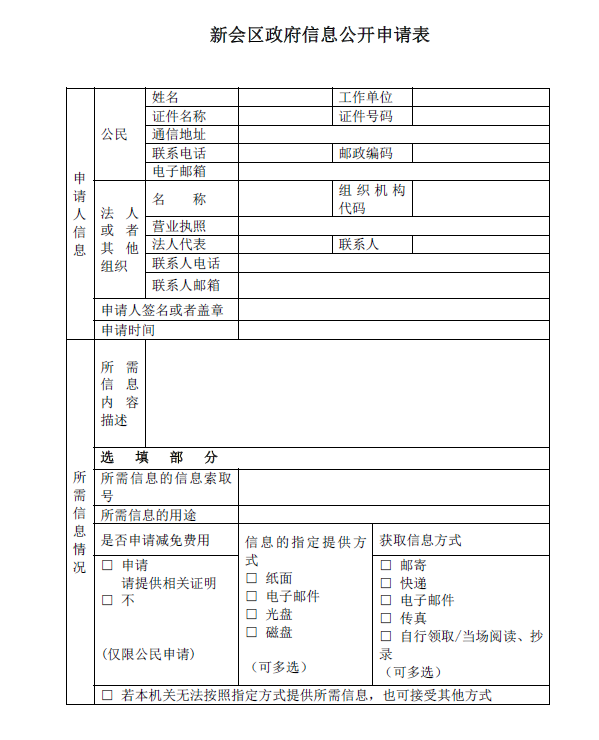 向本机关申请获取政府信息的,应当书面填写《新会区政府信息公开申请表》(以下简称《申请表》,见附件1)。《申请表》可以在受理机构处领取,也可以在本机关网站上下载电子版,复制有效。