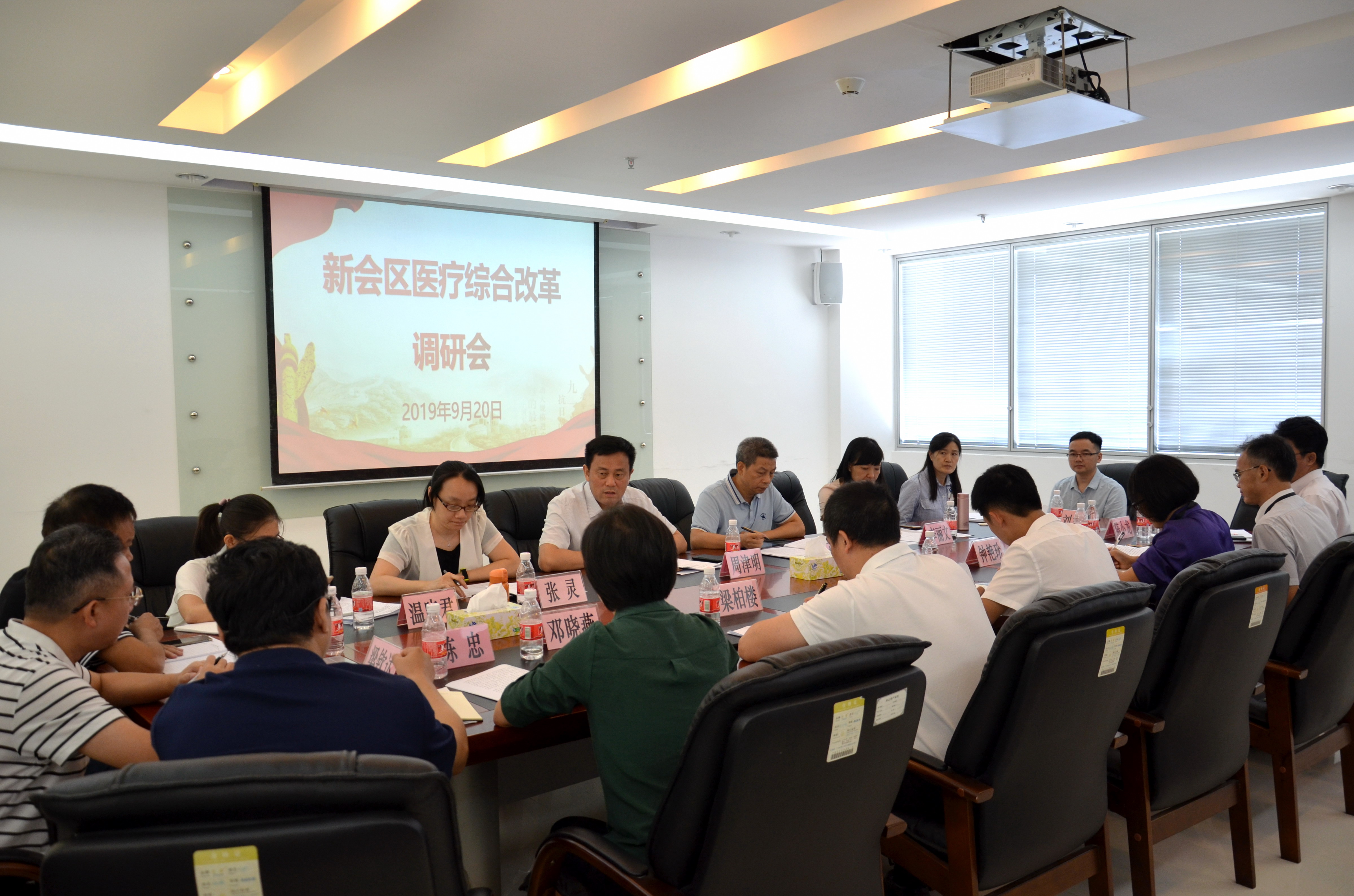 周津明局长对新会区委、区政府高度重视医疗综合改革工作给予充分肯定,认为新会区紧密型医联体试点工作为江门市在医疗卫生体制改革上进行了很多有益的探索,推动了优质医疗资源整合共享和下沉,巩固了“小病不出镇,大病不出区”的就医格局。同时,新会区养老中心、新会区妇幼保健院新院、大鳌镇卫生院综合楼等建设项目也在稳步、扎实推进。对如何做好新会区下一阶段的医疗综合改革工作,周津明强调:一要结合新会区实际,加快探索构建新会区医疗共同体模式,提高区域整体医疗卫生服务能力水平。二要加快推进医养结合养老模式,依托粤港澳大湾区优势资源,建成完善覆盖城乡、湾区资源共享、保障有力、支付合理、人才充备、运行有效的医养结合体制机制,打造立足五邑、服务广东、辐射港澳、面向海外侨胞的集医疗、健康、养老于一体的医养结合示范区。