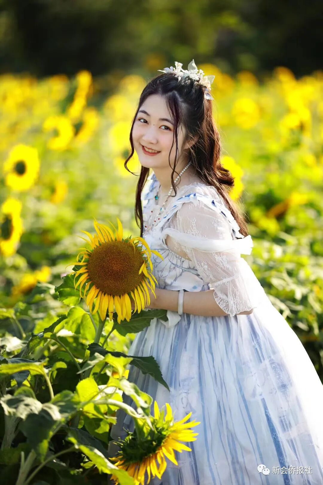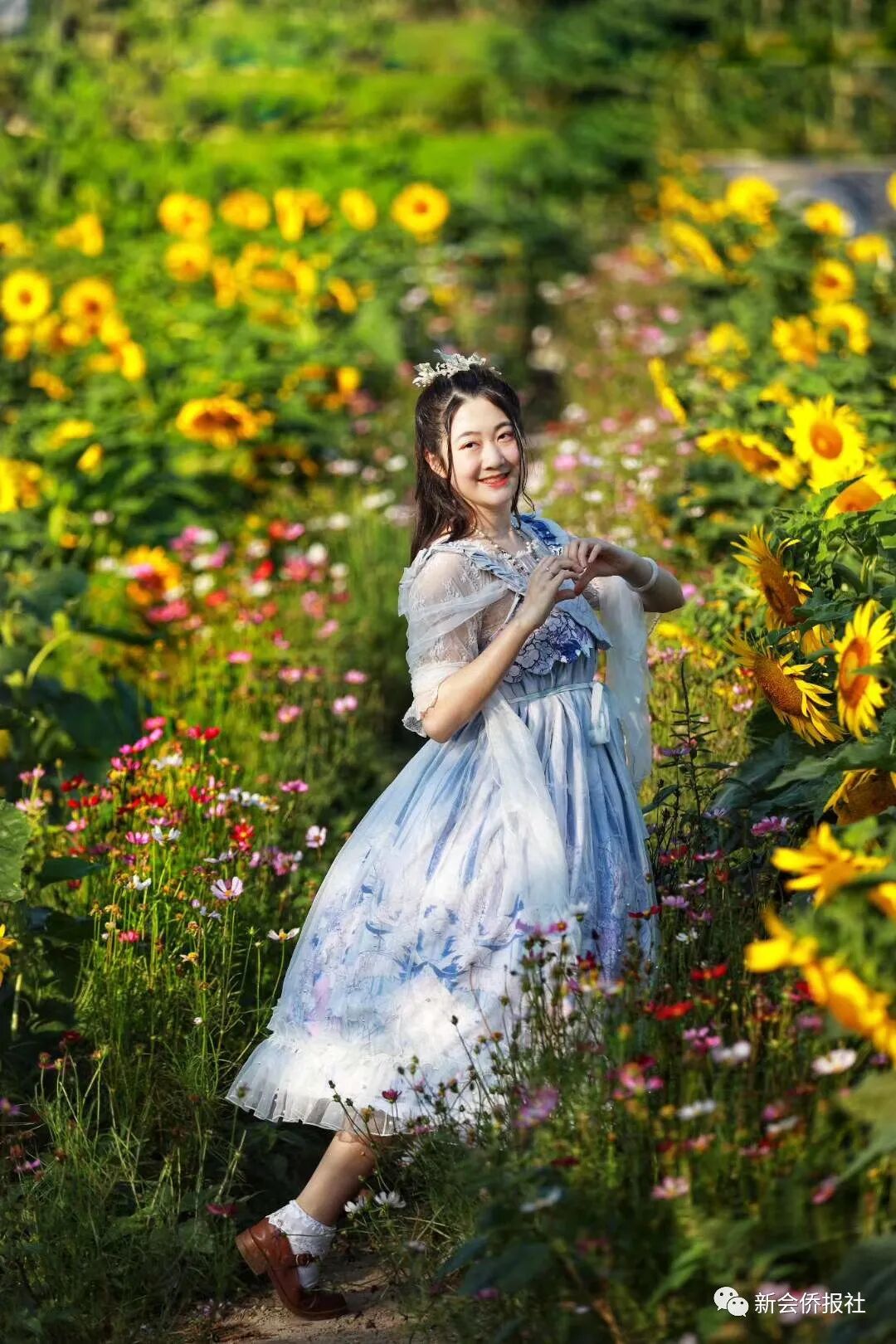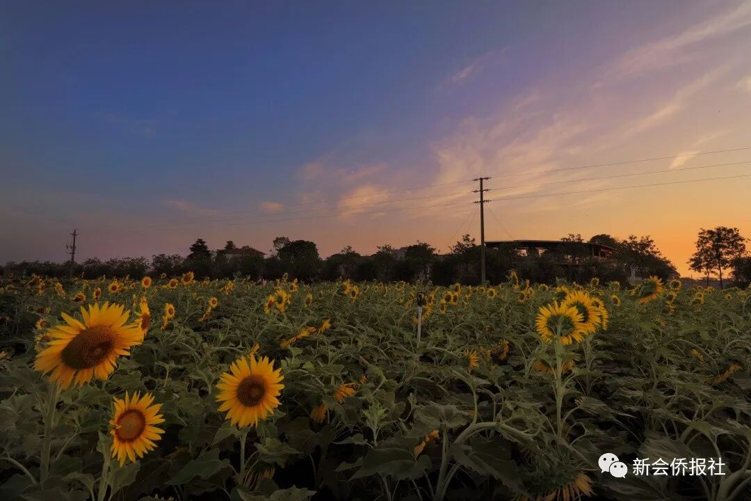 位于新会区大鳌镇东风生态园,一大片约三十亩的向日葵,正是开得最盛的时候。它们面朝东方高傲地立着,在金灿灿的阳光下,它原本黄艳艳的花瓣显得更加明媚鲜亮了。
