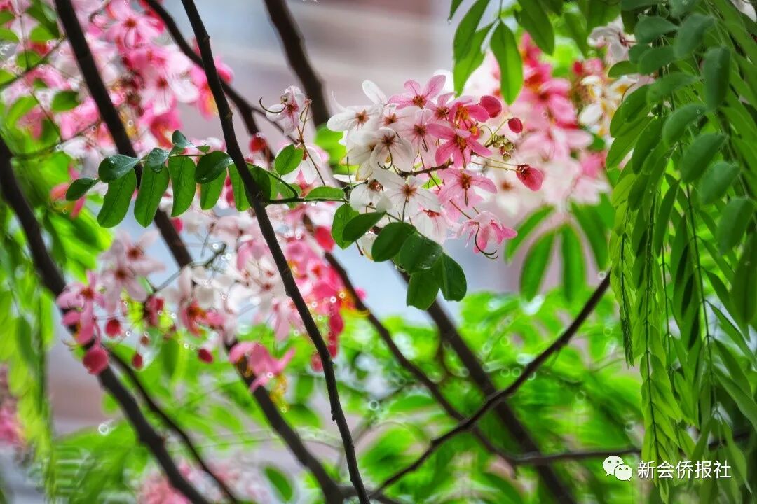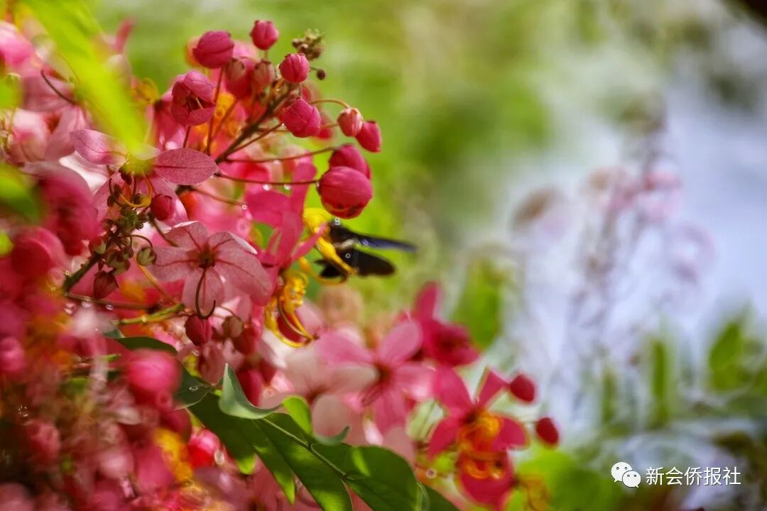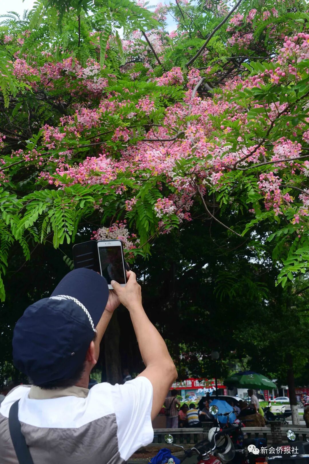 平日,记者上班路过冈州广场外围,甚少在里边逗留。这次来到,才发现早晨的冈州广场原来好美:抬眼望去一棵棵高大挺拔的树被朝阳笼罩着,像披了一层金色的纱;近处,五颜六色的花朵在绿得发亮的叶子烘托下,显得明艳动人;而在树上的鲜花也不甘示弱,与地面的花朵争妍斗丽,散发出沁人心脾的芳香。
