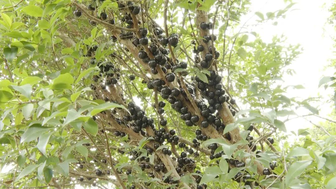走进种植果园,可见枝叶浓绿茂盛的嘉宝果树,树干上长满了密密麻麻的嘉宝果,成熟的嘉宝果呈现出油亮的紫黑色,像一颗颗黑珍珠点缀在树上。由于树种较为少见,有不少市民、游客抱着好奇心前来尝鲜。游客:“从一个短视频上看到这里有嘉宝果采摘,就和朋友一起过来了,这个果口感不错,又甜又滑。”