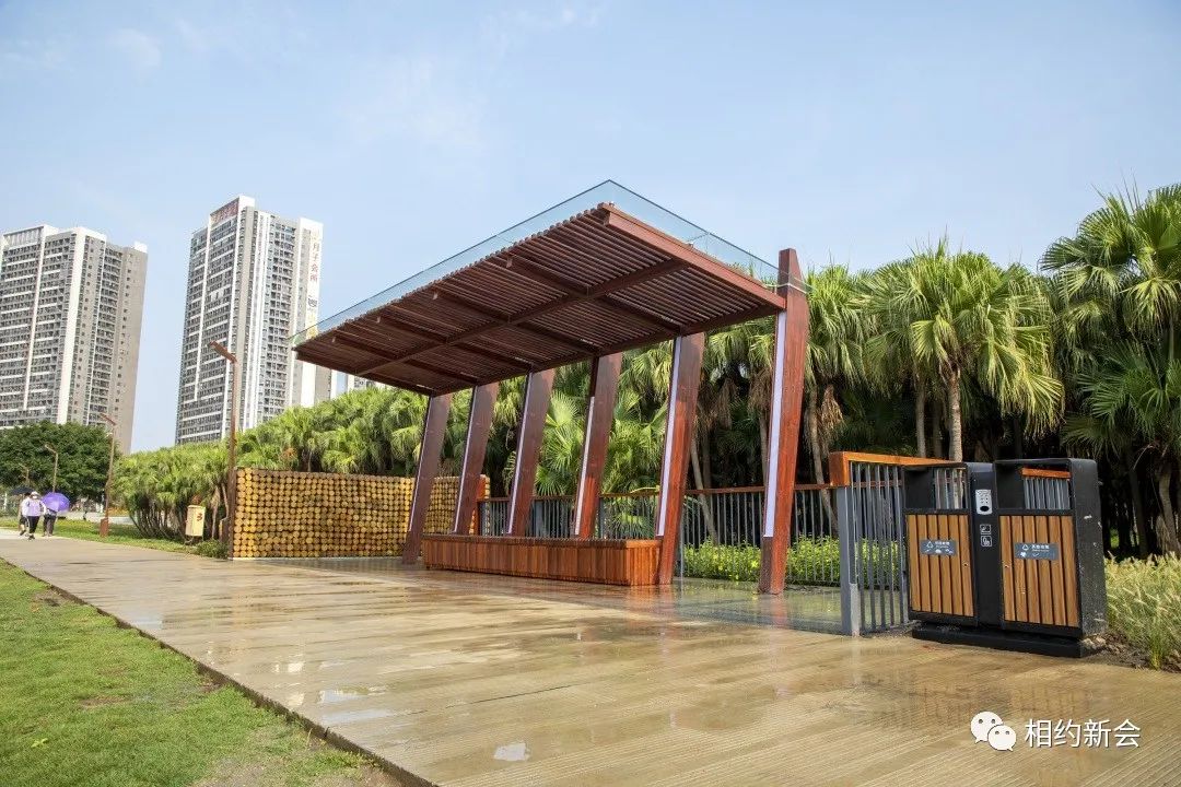 蒲葵是具有新会特色的文化符号。梅江农业生态园(一期)西侧昔日为闲置蒲葵林地。为了凸显葵乡特色,生态园特意保留了葵林区域并对其进行优化改造,延续场地记忆及土地本有功能,让群众“望得见山,看得见水,记得住乡愁”。