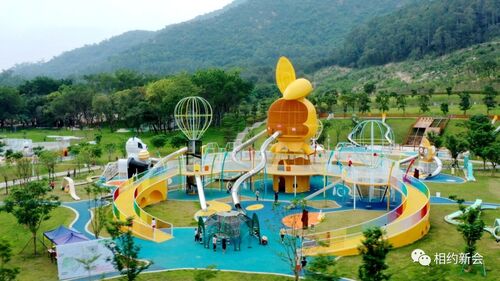 走进公园,首先映入眼帘的是以森林为主题的儿童游乐区。一只黄色巨型的“兔子”站在园区中央迎接小朋友们的到来,现场有一条弯曲的彩虹通道十分亮眼,区域里设置了多条滑梯,小朋友可以顺着攀爬网爬到滑梯入口,然后从又高又长的滑梯滑下来,好玩又刺激。