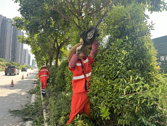 “虽然很热,但还能吃得消。”烈日当空,在明德一路的马路旁,园林绿化工作人员正为翠芦莉、毛杜鹃、福建茶等绿化植物浇水、修剪枝叶。在高温的炙烤下,他们顶着高温,用辛勤的汗水浇灌城市“绿心”,为城市增添一抹抹生机与色彩。“修剪一下更美观,得到广大市民的认同,我们也很开心。虽然天气有些热,出些汗,我们觉得很值得。”江门新会北控绿润城市服务有限公司园林绿篱修剪工容毓灵说。