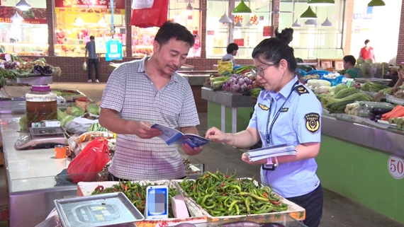学习结束后,新会区市场监督管理局工作人员携带着手册走进仁义市场,逐户进行宣传。工作人员一边递上手册,一边耐心地向商户解释关键内容。
