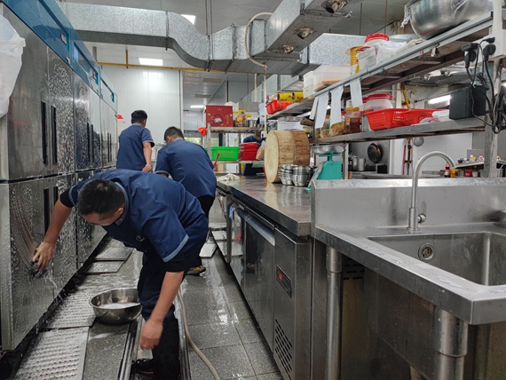 午市结束后,在石涧渔村的厨房里,工作人员正全面清理厨房的环境卫生,特别是对下水道进行彻底冲洗,对地面、台面也进行了细致清洁。此外,结合餐厅地处石涧公园附近、周边绿化茂盛的特点,除了早晚的消杀之外,餐厅还使用天然的艾草香进行驱蚊。同时,安排专人在餐厅周边进行巡查,一旦发现积水便及时清理,有效减少蚊虫孳生环境。