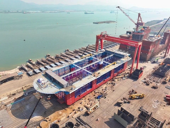 值得一提的是,“珠海琴”下水依托崖门镇威立雅海洋环境工业(广东)有限公司的全球最大机械化梳式滑道(15万吨级)进行,该滑道总长257米,能够满足船舶修、造、拆,以及大型海工结构的制造和上下水,是广东省三大总装平台之一。此前全球首艘自航式水体自然交换型养殖工船“湾区伶仃”号也是在此完成总装下水。