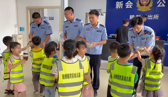 近日,新会区睦洲镇一幼儿园的小朋友们在老师的带领下来到睦洲派出所,给警察叔叔们“送清凉”。