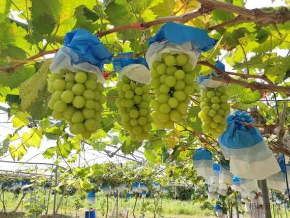 在另一片果园,记者见到一串串阳光玫瑰葡萄被蓝白色的纸袋套着。市民叶女士与朋友正在专注地采摘,轻轻一剪,放入篮中,满心欢喜。“这里的阳光玫瑰葡萄香气浓郁,多汁,又脆又甜,我很喜欢这个品种。”市民叶女士说。