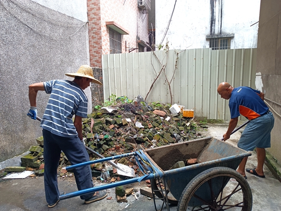 近日,新会区会城街道奇榜村驻村工作组积极发动辖区内的党员干部、热心村民组建清洁小队,对旧村内堆放着建筑垃圾的闲置用地进行清理,实现闲置用地的再利用,确保村居环境干净、舒适。