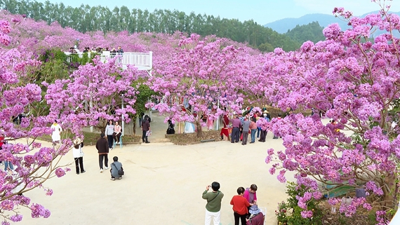 冬日南国,繁花似锦。在新会区绿美生态园,约6000株紫花风铃木正竞相绽放,将冬日装点成一片姹紫嫣红的“童话森林”。