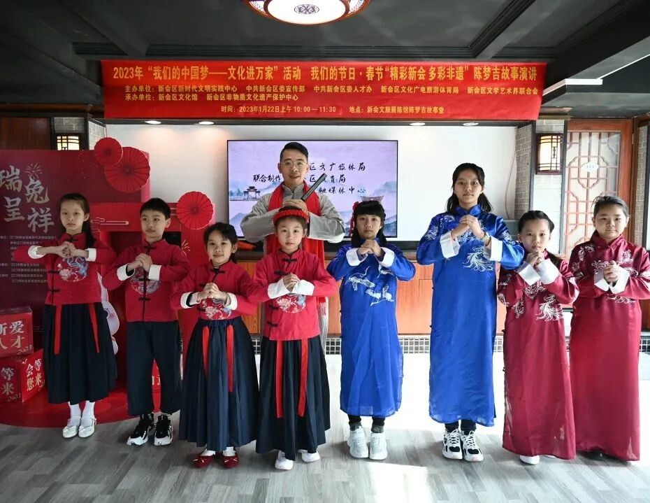 陈梦吉故事区级传承人曹志华老师带领着他的学生在玉湖小苑新会文旅展陈馆陈梦吉故事堂演讲关于陈梦吉的一些经典故事。相传陈梦吉是明代新会一个传奇式的人物,他足智多谋,人称“鬼才”,有“扭计王”、“扭计师爷”之称。他的故事一直在新会及其周边地区广为流传,家喻户晓、街知巷闻,并经过人们的口耳相传而广泛流传至岭南、港澳等地区以及国外。
