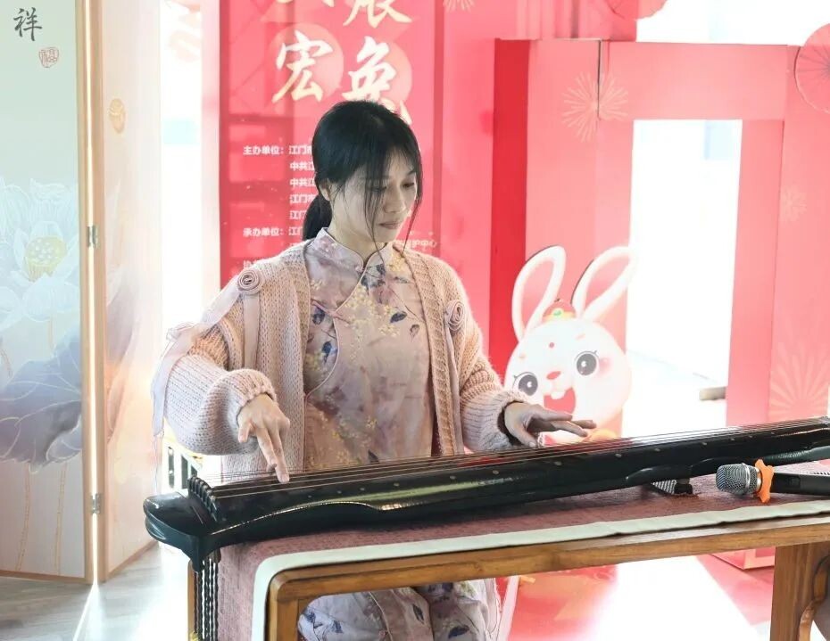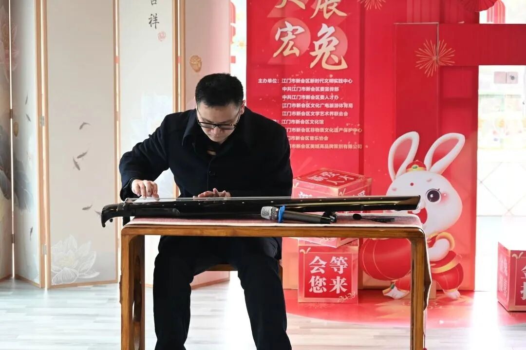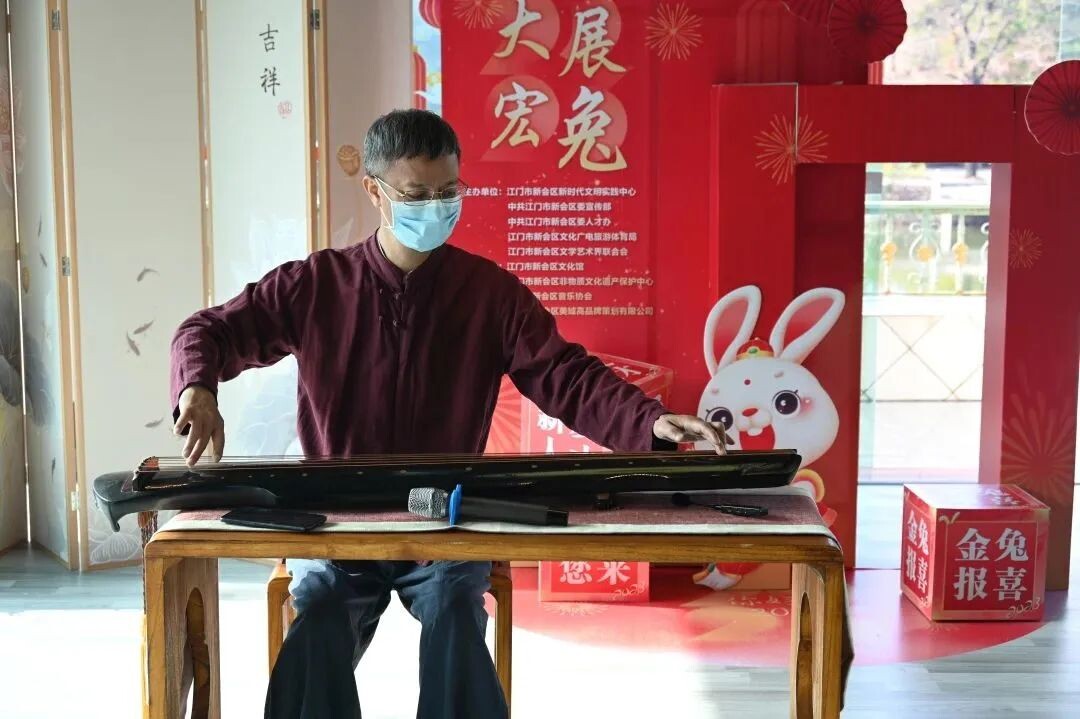 冈州古琴斫制技艺区级传承人黄俊堂老师带领琴人在玉湖小苑古琴雅音堂进行古琴演奏。冈州古琴艺术是江门市级非物质文化遗产。本世纪初,广东古琴研究会到新会搜集古谱,开展琴学研究,推动了冈州古琴艺术的复兴。现场还有古琴实物展示,市民游客们在听琴同时也感受了“为我一挥手,如听万壑松”的古琴魅力。
