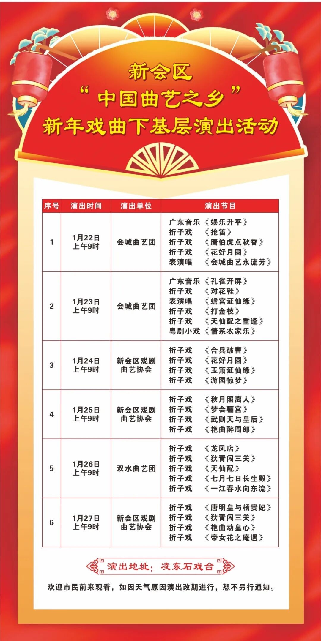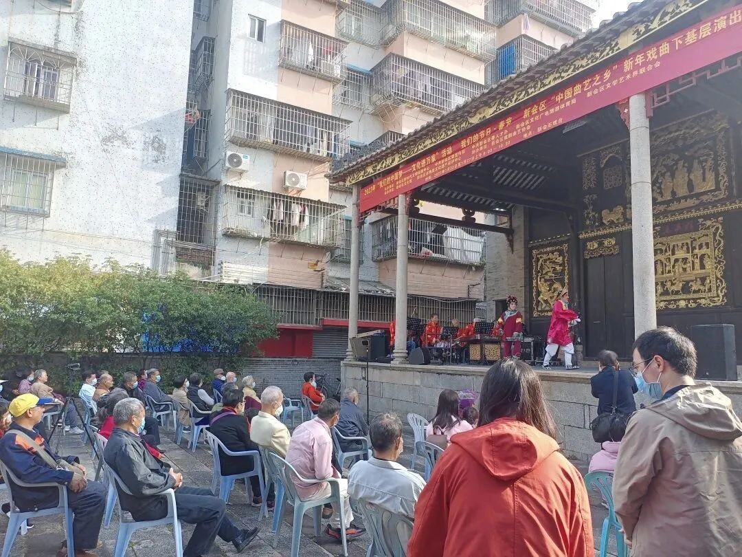 今天的新年戏曲下基层演出活动由会城曲艺团担纲演出,该团分别表演了广东音乐《娱乐升平》,折子戏《抢笛》《唐伯虎点秋香》《花好月圆 》,和表演唱《会城曲艺永流芳》等五个节目。会城粤曲是新会区区级非物质文化遗产项目,近年来越来越受到人们的关注。初一至初六上午在新会石戏台,初三、初四、初六下午在玉湖小苑新会文旅展陈馆,都会有传统的戏曲演出,欢迎大小戏迷一起约看,一同感受粤剧文化魅力。