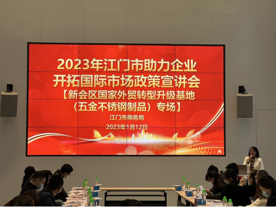 为助力企业出海抢订单,江门市商务局于1月12日上午在新会区银洲湾科创产业园召开2023年江门市助力企业开拓国际市场政策宣讲会(新会区外贸转型升级基地专场),我区共发动33家企业积极参会,鼓励我区外贸企业积极开拓国际市场。