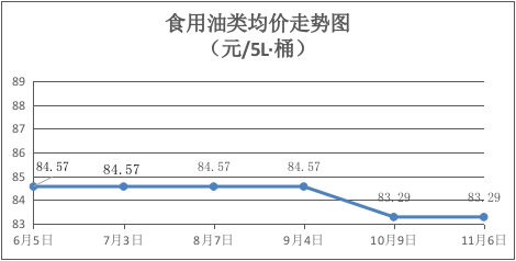 食用油类商品价格保持稳定。本期所监测的7种食用油(5L装)商品均价为83.29元/桶,环比持平。其中:鲁花花生油、金龙鱼花生油、菜籽油、大豆油、金龙鱼调和油、玉米油零售均价分别为每桶156.00元、98.00元、67.00元、58.00元、73.00元、73.00元,环比均持平。