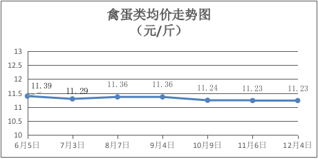 禽蛋类商品价格稳定。本期所监测的5种禽蛋类商品均价为11.23元/斤,环比持平。其中:鸡肉、鸭肉、鸡蛋、鸭蛋零售价分别为每斤17.50元、16.00元、7.15元、6.75元,环比均持平。