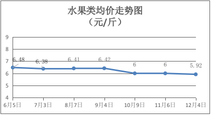 水果类商品价格轻微下降。所监测的6种水果综合均价为5.92元/斤,环比下降1.33%。其中:苹果、香蕉、葡萄、梨、橙子、西瓜零售均价分别为每斤7.65元、3.10元、12.00元、4.75元、5.00元、3.00元,环比分别下降4.38%、持平、持平、下降3.06%、持平、持平。