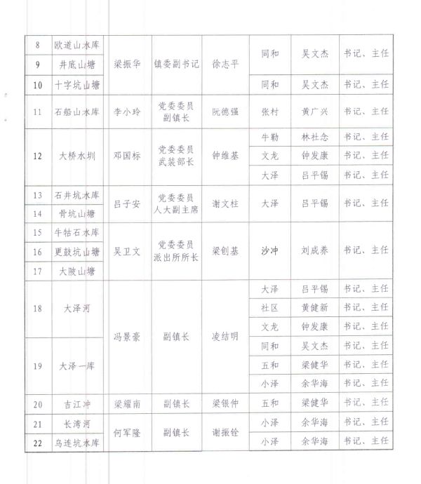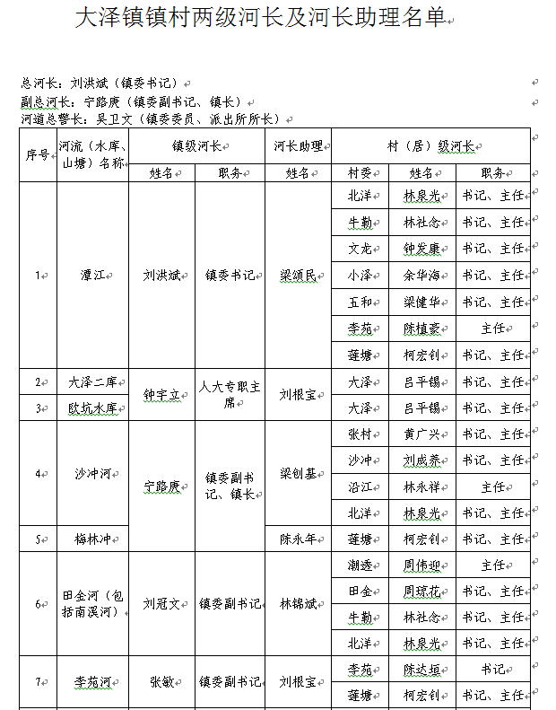 为进一步加强大泽镇全面推行河长制工作,结合人事变动,经镇委、镇政府同意,决定调整镇级河长及河长助理名单。调整后成员名单请见附件。