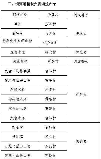 各村、有关部门: 因人事变动和工作关系,经古井镇委、镇政府研究,现将古井镇河流、水库、山塘河长及河道警长名单调整如下: 特此通知中共江门市新会区古井镇委员会江门市新会区古井镇人民政府2019年9月19日