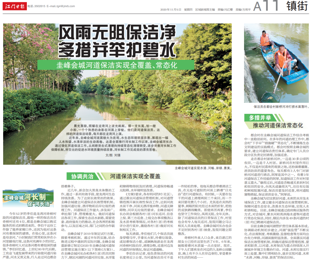 近几年,新会加大黑臭水体整治工作,通过一系列有效手段,使龙湾河生态持续改善。为了达到长效常治的效果,圭峰会城建立河道保洁长效管理机制,加强河道垃圾、漂浮物和沿岸垃圾的清理工作。河道保洁工作量大、涉及面广,牵扯部门多、管理难度大。做好河道保洁各项工作,探索生态洁水新路,需要党委、政府强有力的推动,社会各界的积极参与,以及区域之间、部门之间的合作联动。