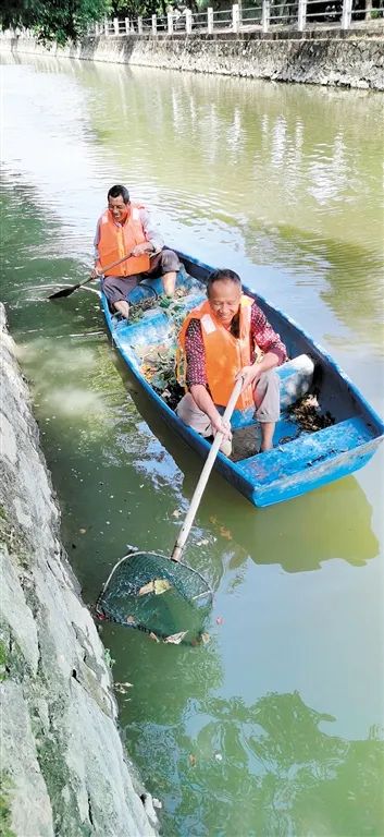 每天清晨,李伯他们几个保洁员就身穿橙马甲,手拿长火钳,拎着垃圾袋,或划着保洁小船,或娴熟地游走在龙湾河奇榜村段沿岸,清理杂物,巡查河边及河道的环保情况,保证河道通畅。
