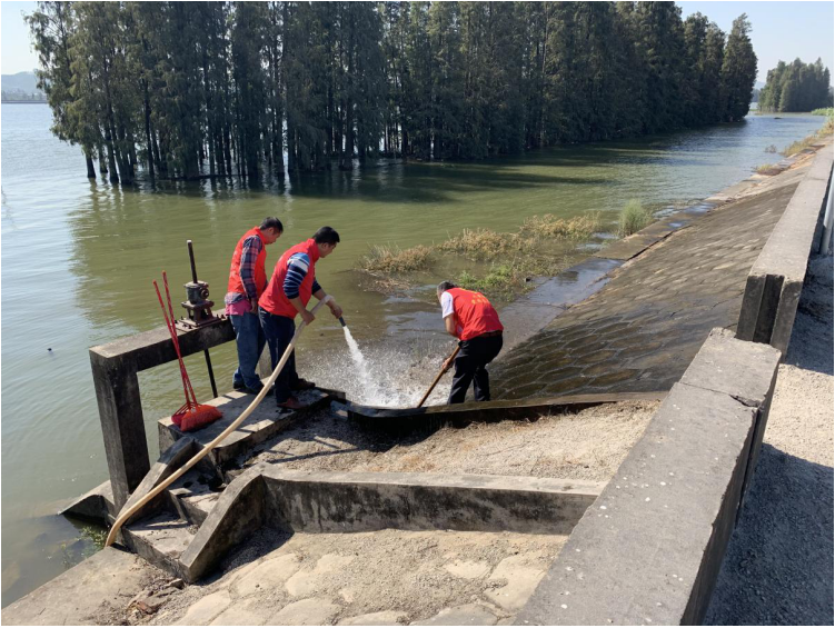 志愿者们顶着烈日,发扬吃苦耐劳的精神,不怕脏、不怕累,对围堤周边的环境进行清洁。