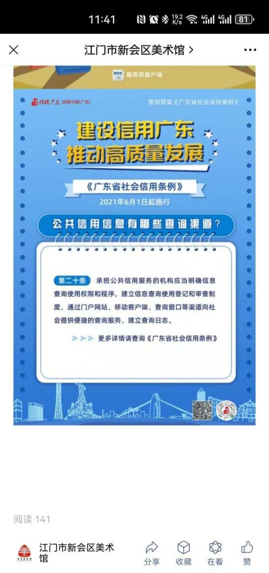 新会区美术馆通过网站、公众号以及馆内公共区域LED显示屏、广告屏等形式,持续发布和循环播放广东省社会信用条例宣传资讯,并在咨询服务台摆放广东省社会信用条例宣传小册子以及安排志愿者向参观群众进行派发和知识解答,继续配合做好《广东省社会信用条例》宣传工作。