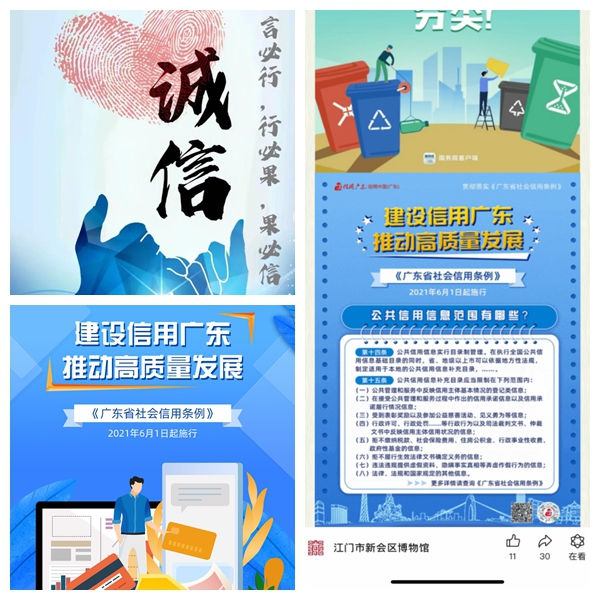 为持续深入推进社会信用体系建设,巩固提升干部职工、群众的诚信意识,营造浓厚的诚信文化氛围,近日,新会博物馆结合年终工作实际,依托年末文化活动较为集中的有利契机,通过线上线下联动、阵地服务融合、活动载体赋能等多种形式,扎实开展诚信宣传工作,让诚信理念深入人心。