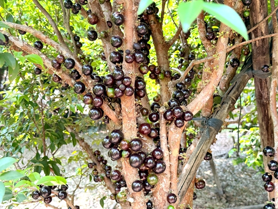 走进新果皇生态园,在130亩的种植基地上,15000多棵嘉宝果树构成独特景观,紫黑色的果实如黑珍珠般密集附于主干,其中沙巴品种占比达90%。该品种果径达3厘米,果肉厚实,兼具酸甜口感和玫瑰香气,深受市场欢迎。